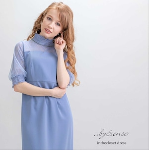 重ねレース パフスリーブ タイトドレス ライトブルー