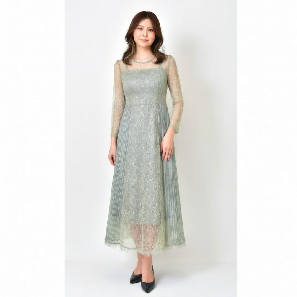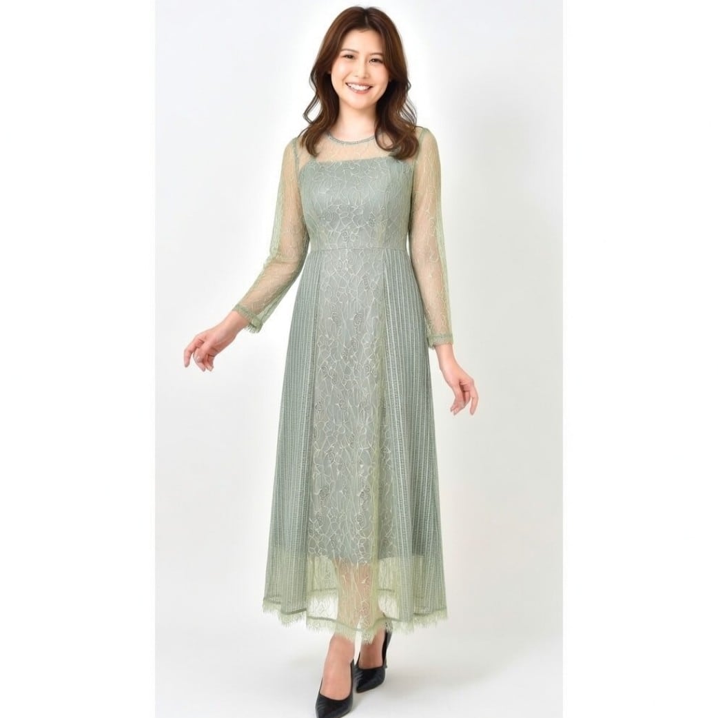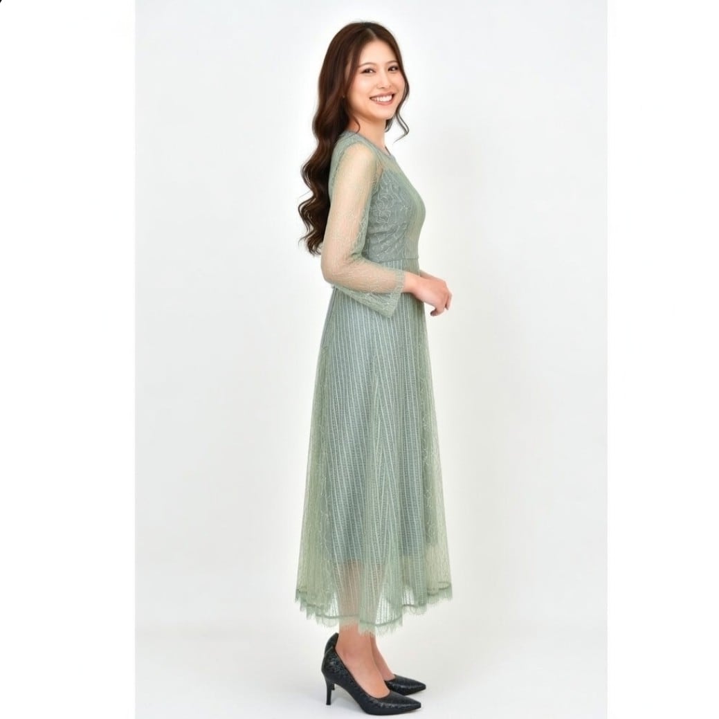 ライトグリーン Lサイズ 袖つきストライプレースドレス【結婚式お呼ばれ】/浜松ドレスショップ/by6sense in the closet
